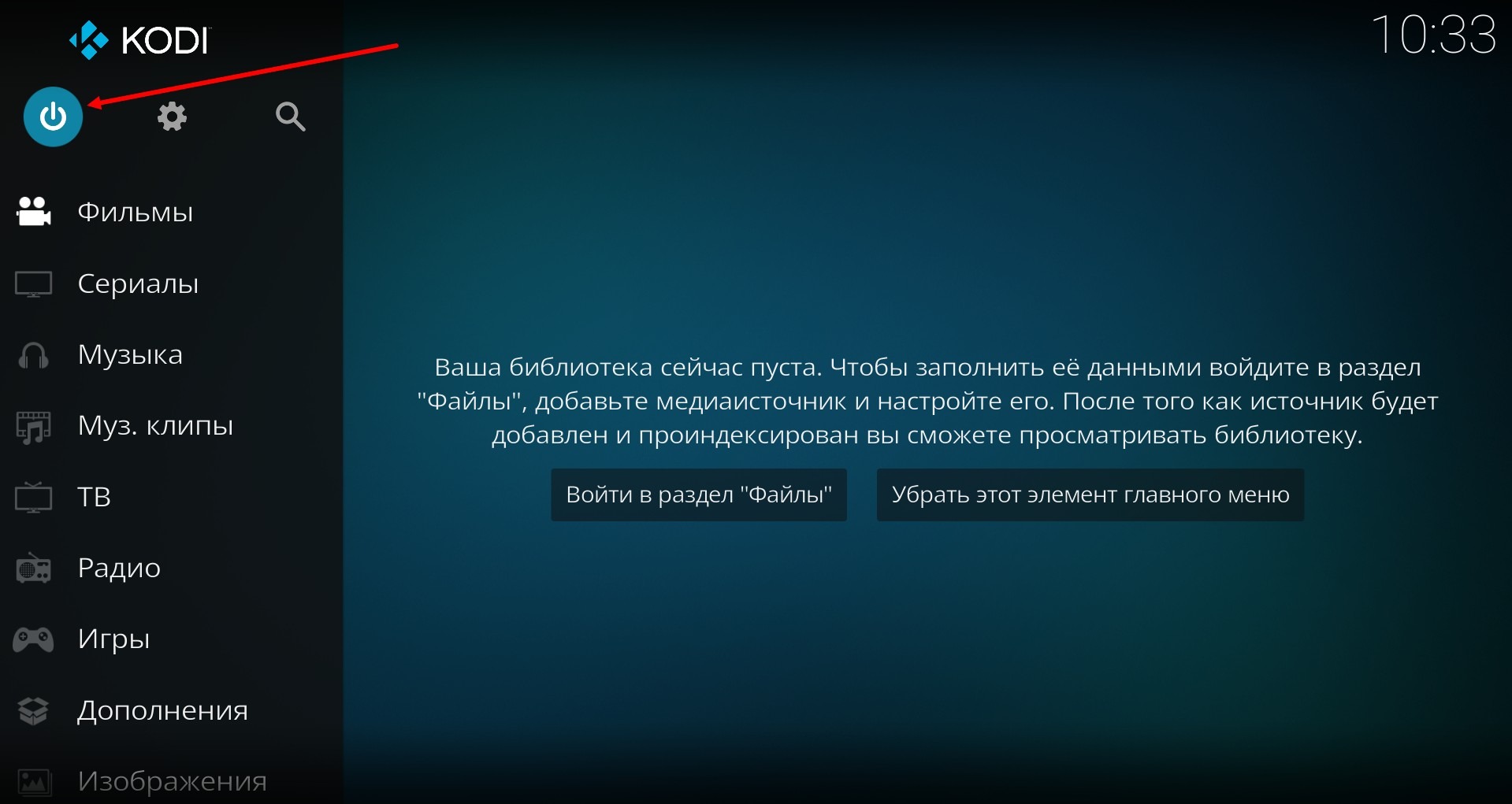 Wir starten Kodi neu, indem wir aus der Anwendung heraus aussteigen, indem wir auf das Ausschalt-Symbol klicken.
