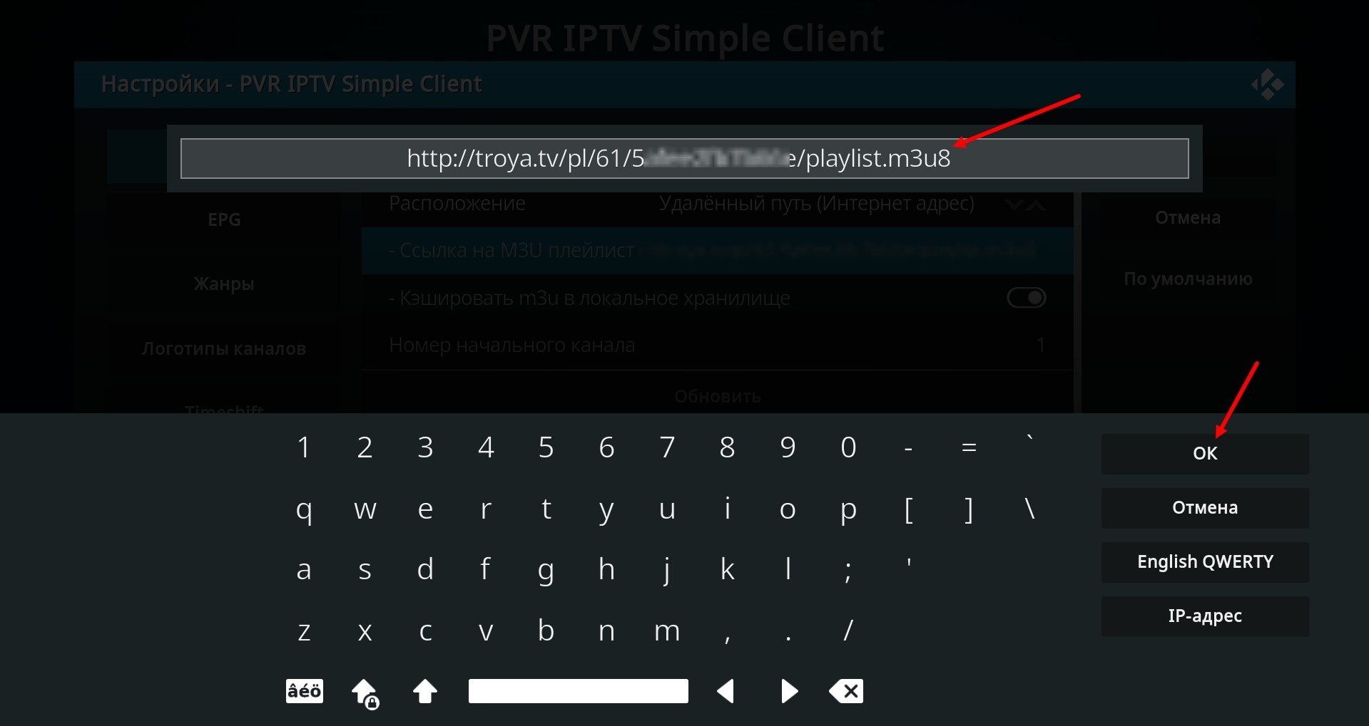 In dem sich öffnenden Fenster geben wir den Link zu EPG ein, den wir aus dem persönlichen Konto erhalten haben, zum Beispiel wie im Bild unten gezeigt. Drücken Sie OK.