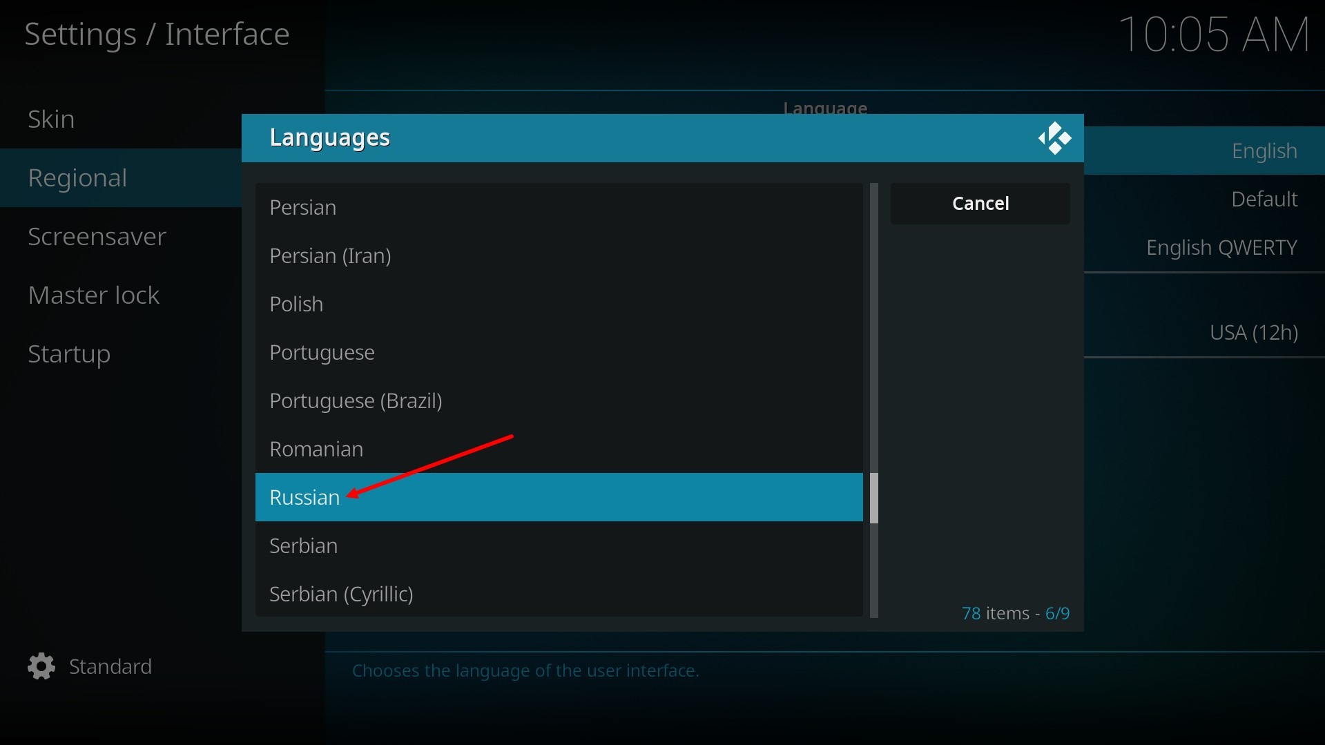 Im Folgenden wird die Konfiguration von Kodi behandelt, laden Sie die gewünschte App-Version herunter und starten Sie die Installation auf Ihrem Gerät. Nach der Installation müssen Sie als Erstes (falls erforderlich) die gewünschte Sprache für die Benutzeroberfläche der Anwendung auswählen.