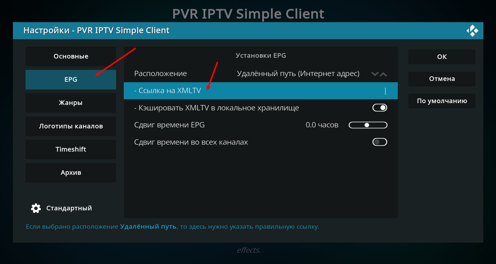 Wir gehen zu den EPG-Einstellungen, stellen erneut sicher, dass die EPG-Lage Remote-Pfad (Internetadresse) im entsprechenden Feld ausgewählt ist. Wenn nicht, machen Sie es wie im Bild unten gezeigt und klicken Sie auf das Feld unten, wo "XMLTV-Link" steht.