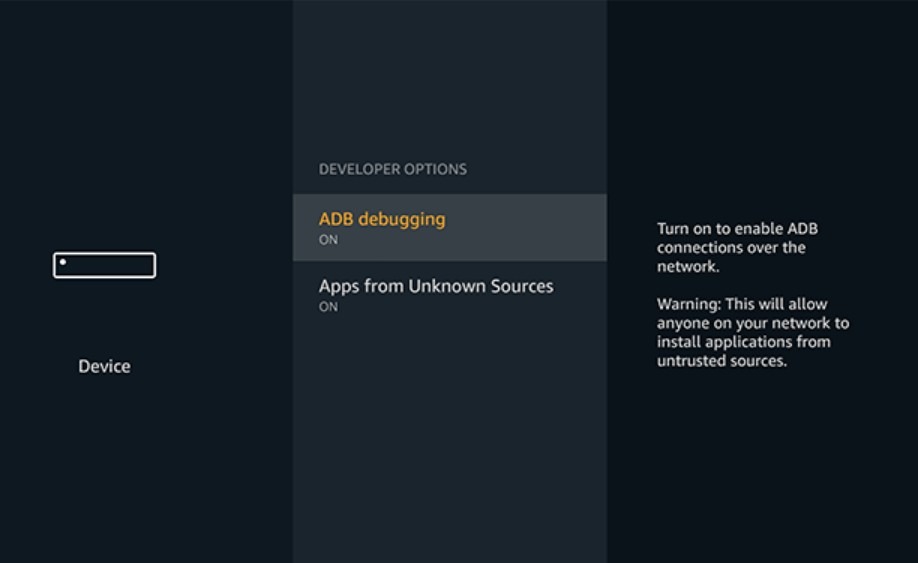 Zuerst müssen Sie auf dem Fire TV Stick die Installation von Anwendungen erlauben, die nicht aus dem Amazon-Shop stammen (aus unbekannten Quellen). Dazu gehen Sie zu Settings -> System -> Developer Options (oder Settings -> My Fire TV -> Developer Options) und aktivieren die Optionen ADB Debugging und Apps from Unknown (oder Install unknown apps). Beispiele für Fenster sind unten dargestellt: