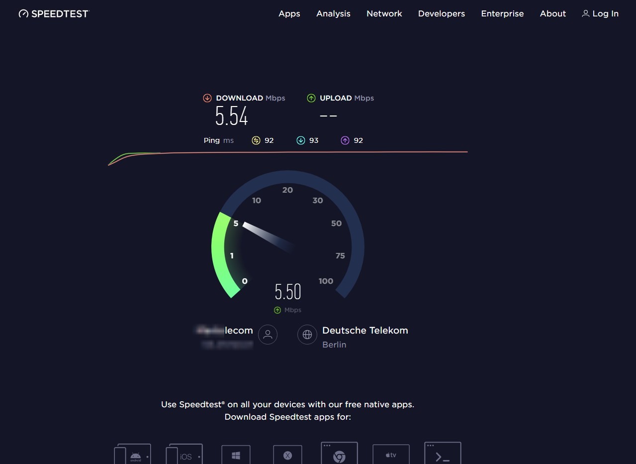 Good speed, no doubt, but this is the speed within your provider's network, i.e., from your computer/smartphone to the nearest provider's server, which can be located a few hundred meters to several kilometers away from you. Unfortunately, our servers are not within this network, so the measurement needs to be done differently.