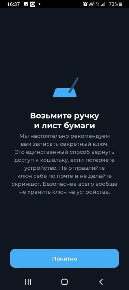 You should write it down or take a screenshot and print it out. It is recommended not to store this key on the same device where you have Tonkeeper installed.