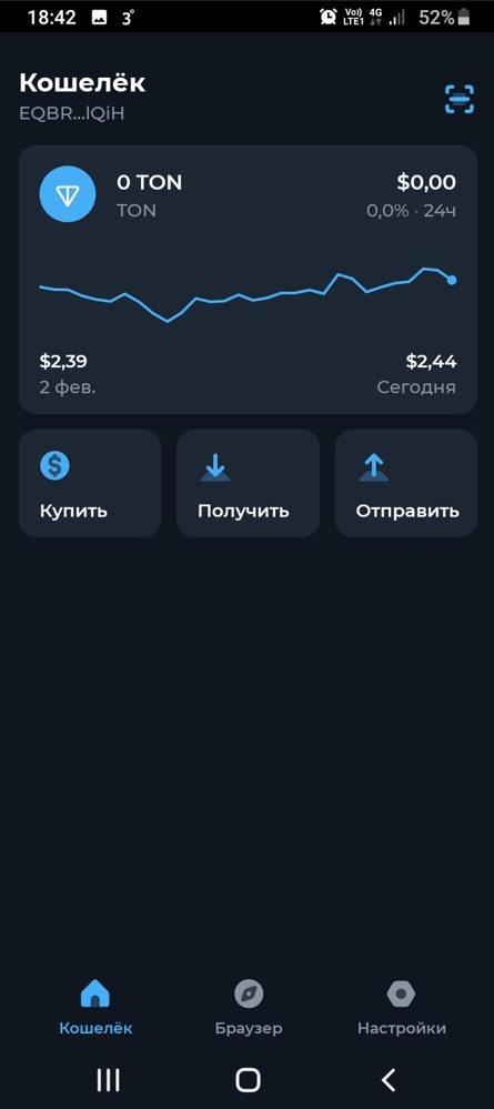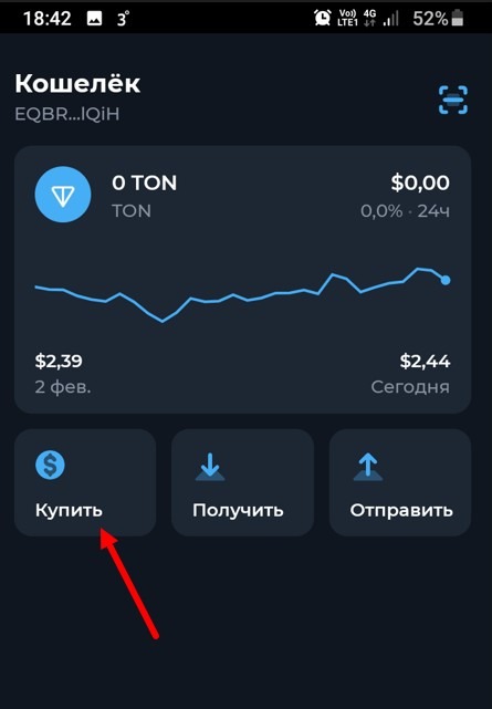 Go back to the main page of the TonKeeper application and, if the funds have already been credited to the balance, press the barcode scanner icon. If not, wait until the funds are credited.