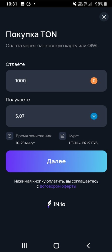 The Dreamwalkers option offers a minimum top-up amount of 3000 rubles, that is more than 15 TON, about 38 bucks, but the rate is slightly lower than for the 1N.io option, which has a minimum top-up of 1000 rubles (more than 5 TON, about $15).