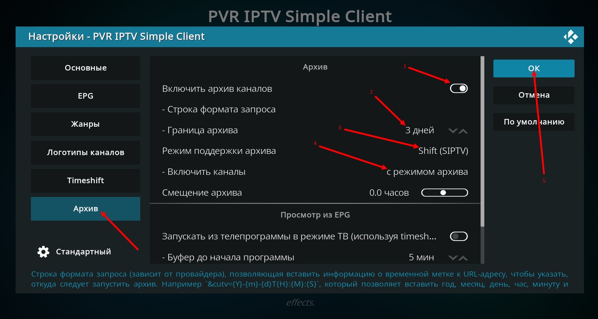 Move on to the archive settings (if you don't see the "Archive" menu item in your settings, try scrolling down in this menu, maybe this item is just hidden beyond the window), enable the use of the archive (1), set the archive limit (2) according to the information indicated in the EPG (mine is set to 3 days), select the archive support mode Shift (SIPTV) (3), choose to enable channels with archive mode (4) and press OK (5).
