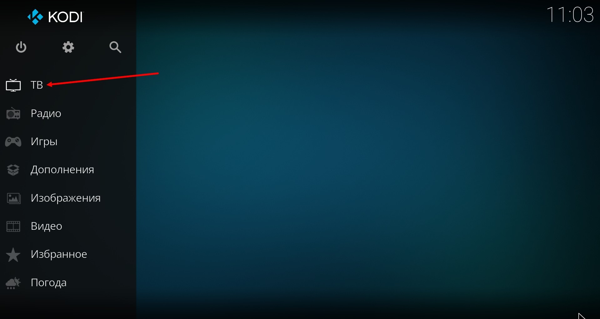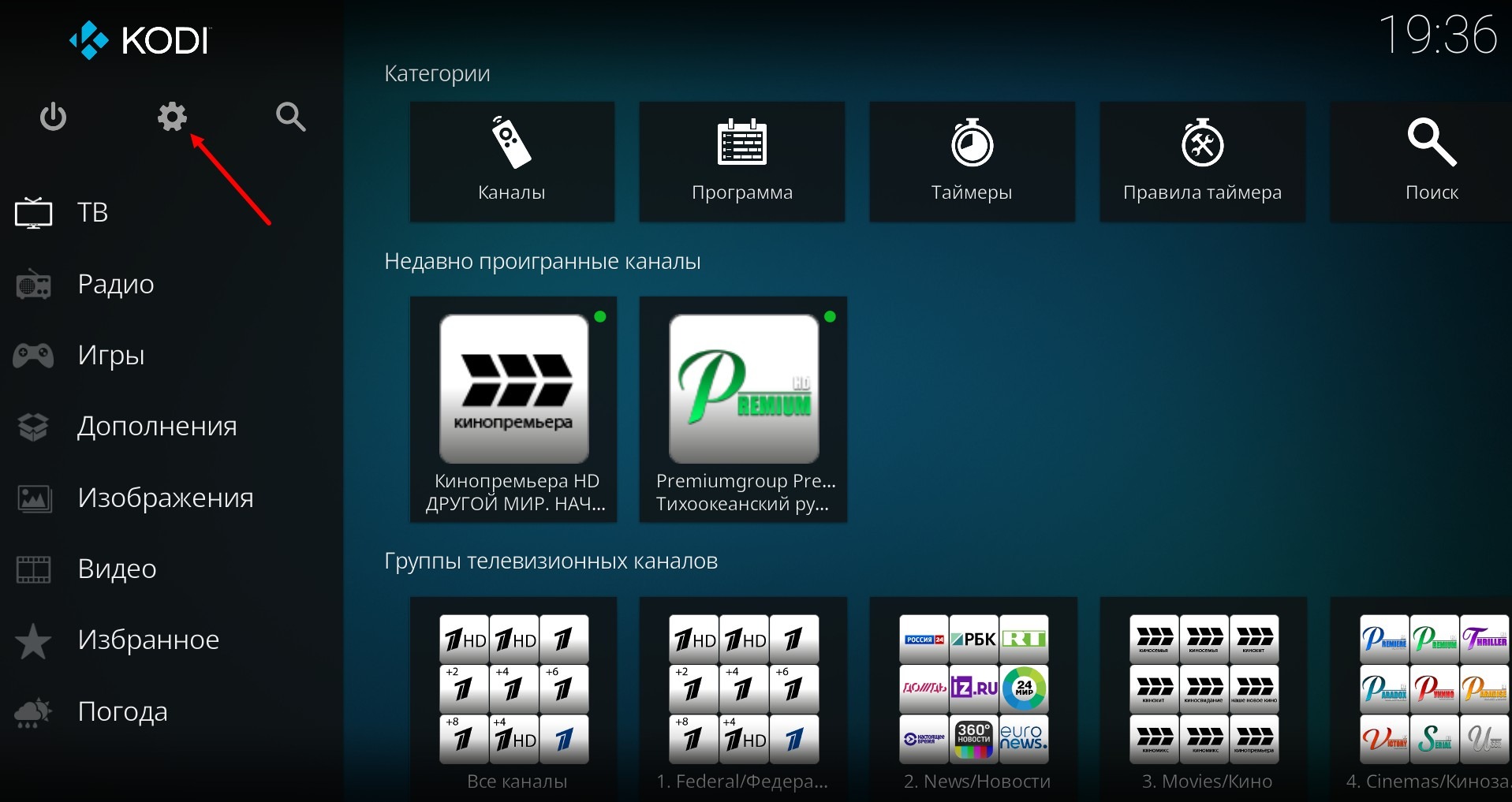 If you need to return to the configuration of the PVR client, press Esc several times until you get back to the main Kodi menu. Press the gear icon.