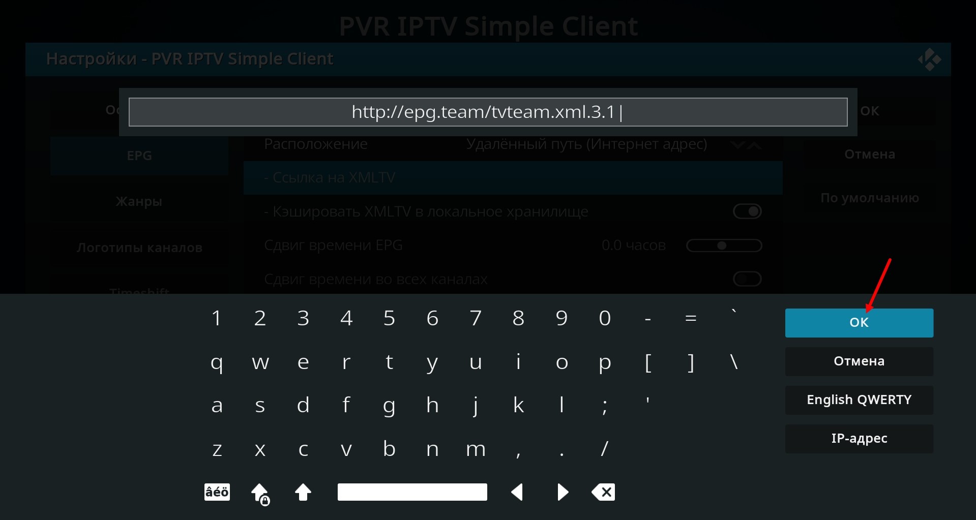 In the window that opens, enter the EPG link taken from your personal account, for example as shown in the picture below. Press OK.