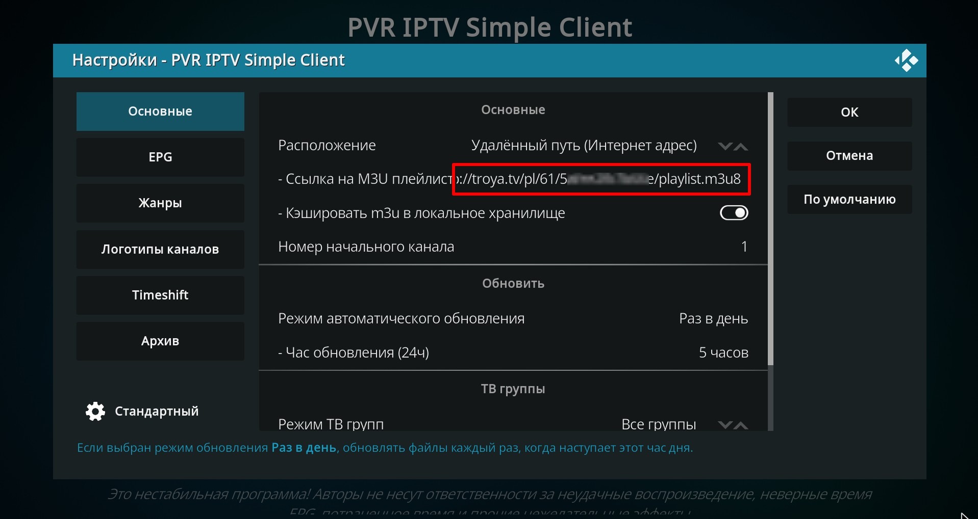 In the Basic menu, check the Location item (it should be as shown on the screenshot) and in the box pointed to by the arrow, enter the playlist address (playlist link) of Kodi.