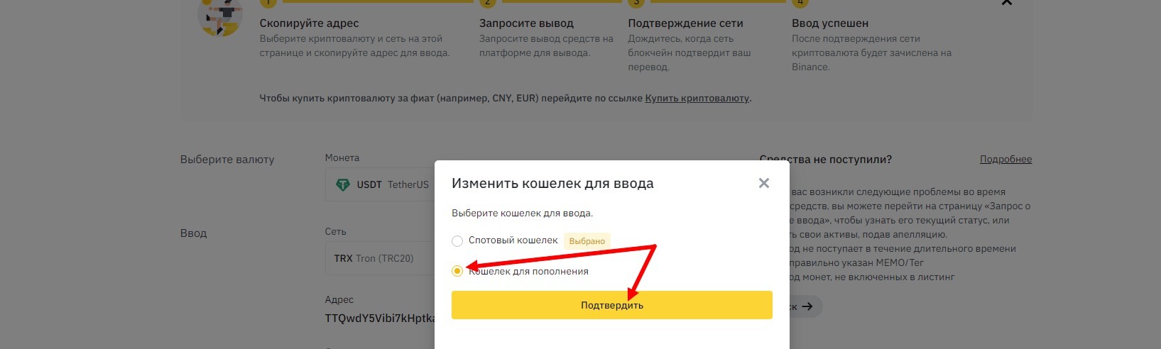 то измените его на кошелек для пополнения и подтвердите изменение.