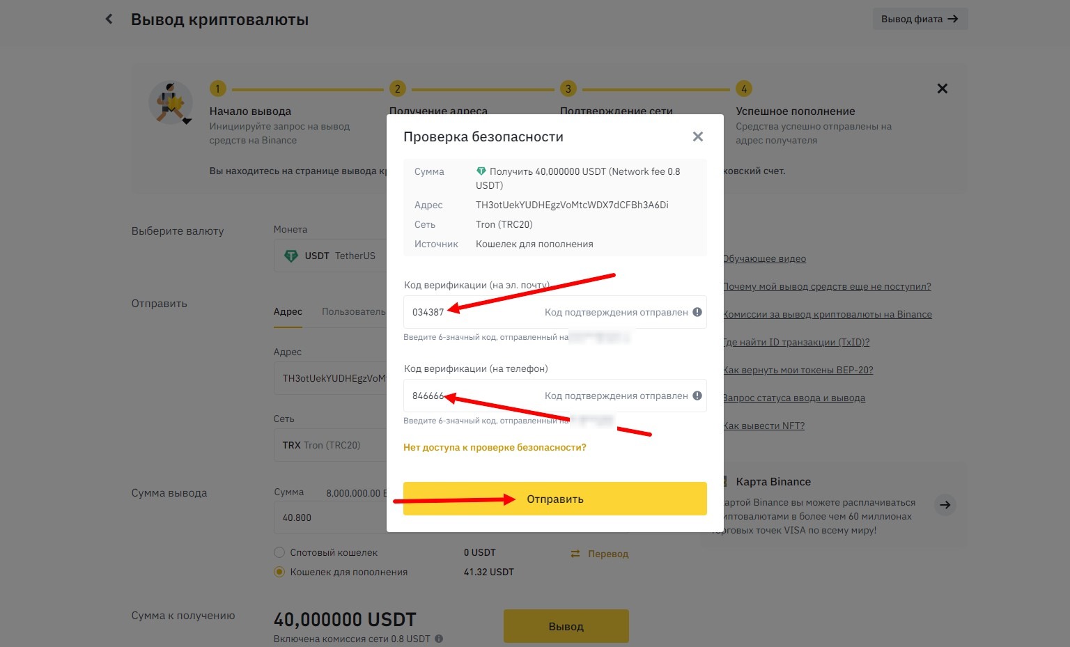 С этим этапом нужно быть внимательней, формы ввода кодов меняются, один раз сначала идет форма для ввода кода на емейл, а потом форма ввода кода на телефон, другой раз сначала форма ввода кода на телефон, а потом на емейл. Если вы введете не верно коды, то вывод средств вам может быть заблокирован на несколько часов (у меня было на 20), поэтому будьте внимательнее.