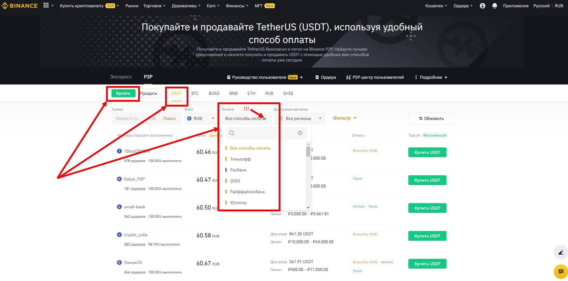 Открывается окно, в котором выбирайте Купить (стоит по умолчанию), валюта USDT (стоит по умолчанию) и способ оплаты в строке фильтров.