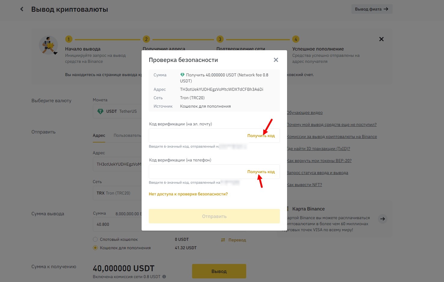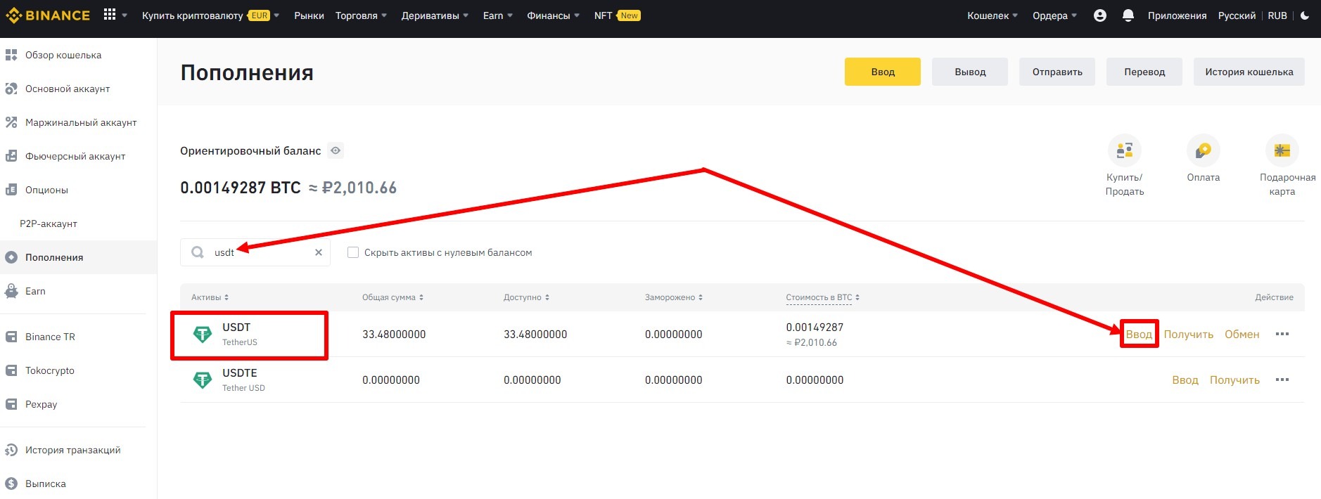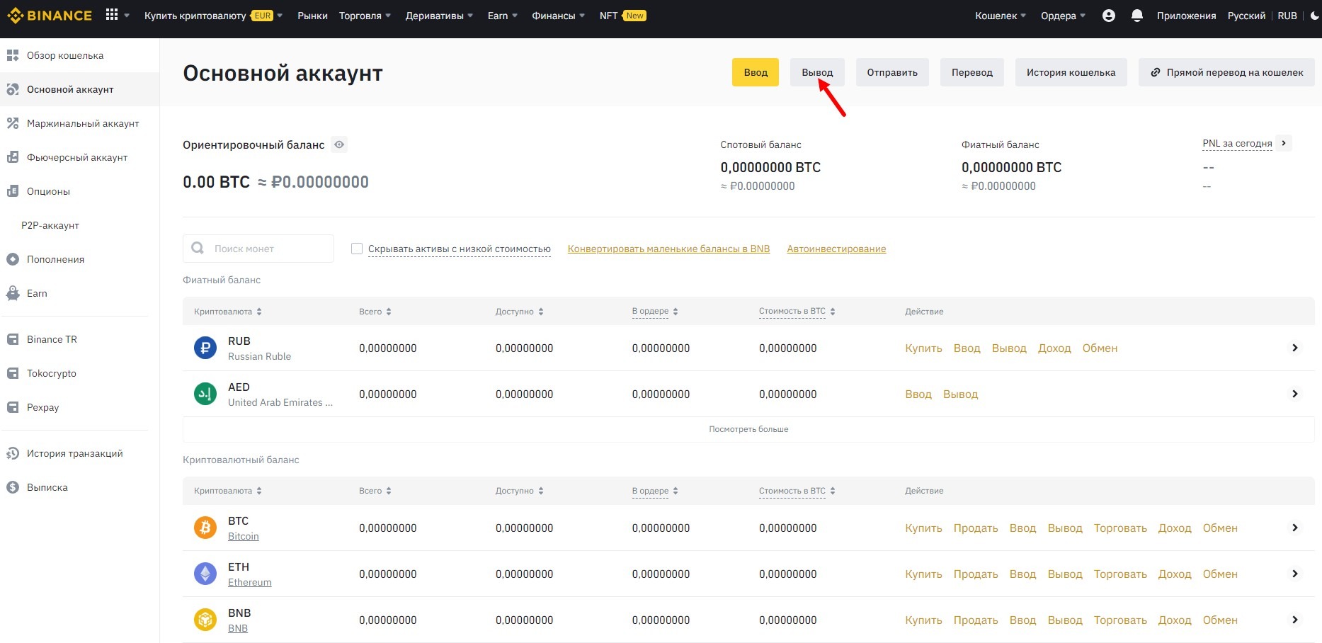 Снова переходите в кабинет бинансе и заходите в Кошелек - Кошелек для пополнения - нажимаете Вывод