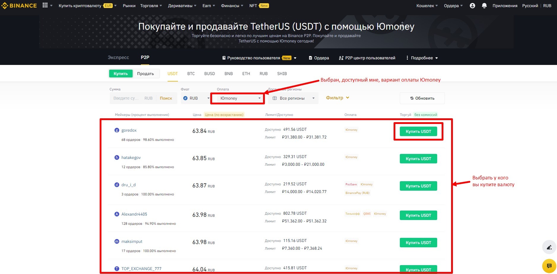 На следующем скрине у меня выбран способ оплаты Юmoney, в списке продавцов остались только те, которые готовы вам продать крипту за ваши Юmoney.