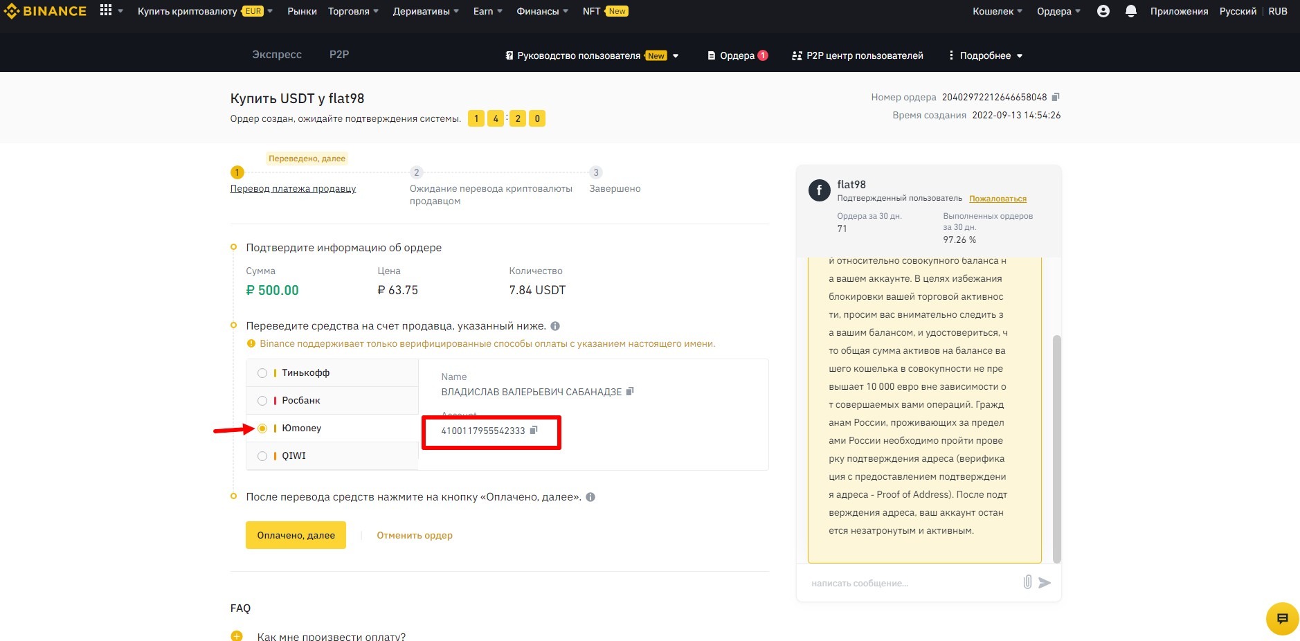 Немного выждал и нажал кнопку Оплачено, далее. Обратите внимание, что время на проведение всех операций ограничено 15 минутами, поэтому начав покупку валюты, не уходите на перекур или не отвлекайтесь на звонок, если вы просрочите сделку, то вам могут заблокировать акк бинанс. Возможно не с первого раза.